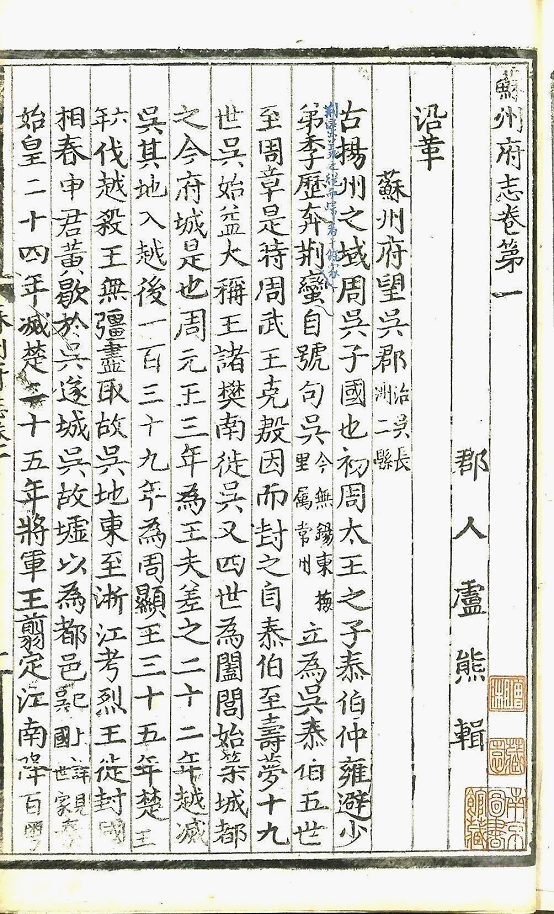“入国朝,吴县教谕卢熊,闵前志之乖纷,以为苟不合而一之,恐不足示来者。乃揽众说,摭遗事,芟繁取要,族别类分……成书五十卷,于是数百里之内,二千载之间,其事可按书而得矣。”