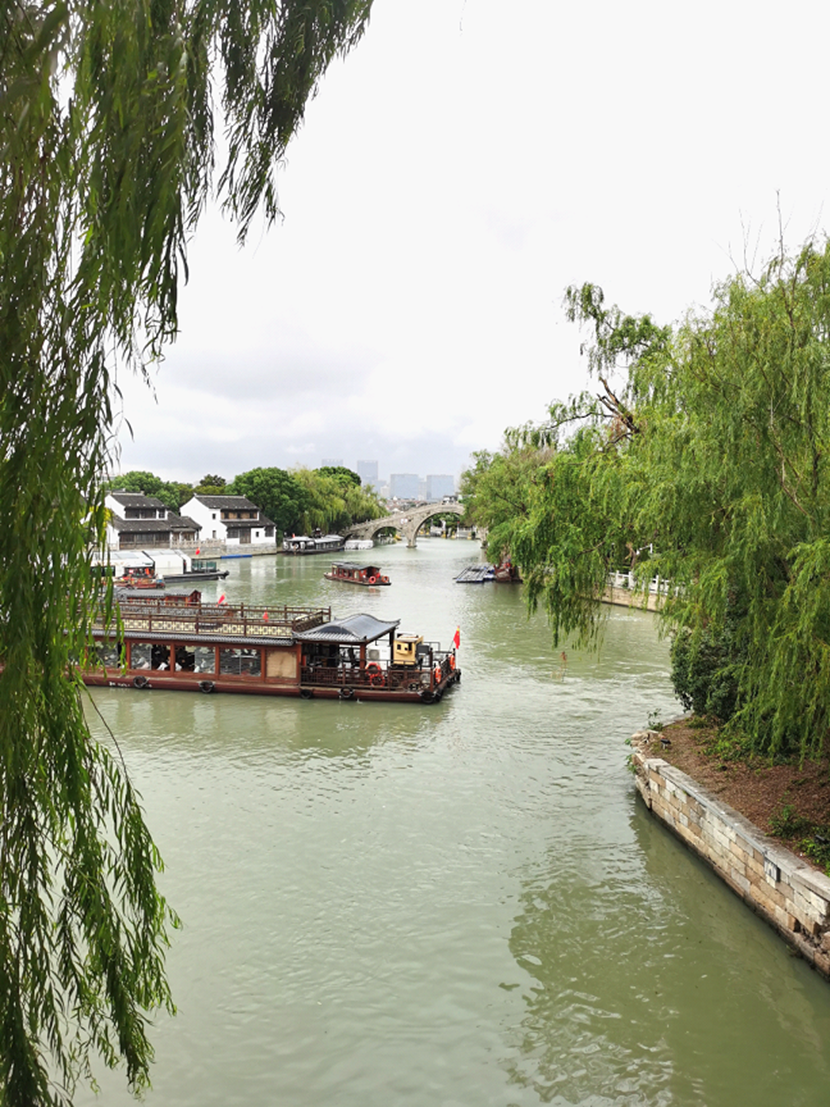 站在阊门西边不远的吊桥上凭栏而望,浅灰色的天空似一笺透着淡淡水墨香味的新纸,清波流光,游船穿梭,拱桥垂虹,店肆林立,游人如潮,风软柳柔,一幅活色生香的《姑苏繁华图》铺展在我的眼前。