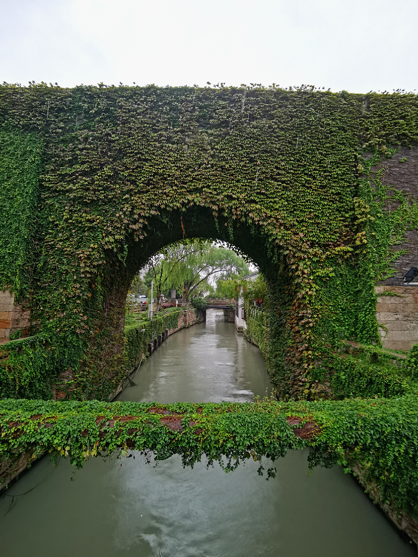 一只孤独的小船静静躺在水城门对面的小石桥下,在它周围,水城门上,桥栏上,石驳岸上,郁郁葱葱的爬山虎铺出满眼青绿,平添野趣。