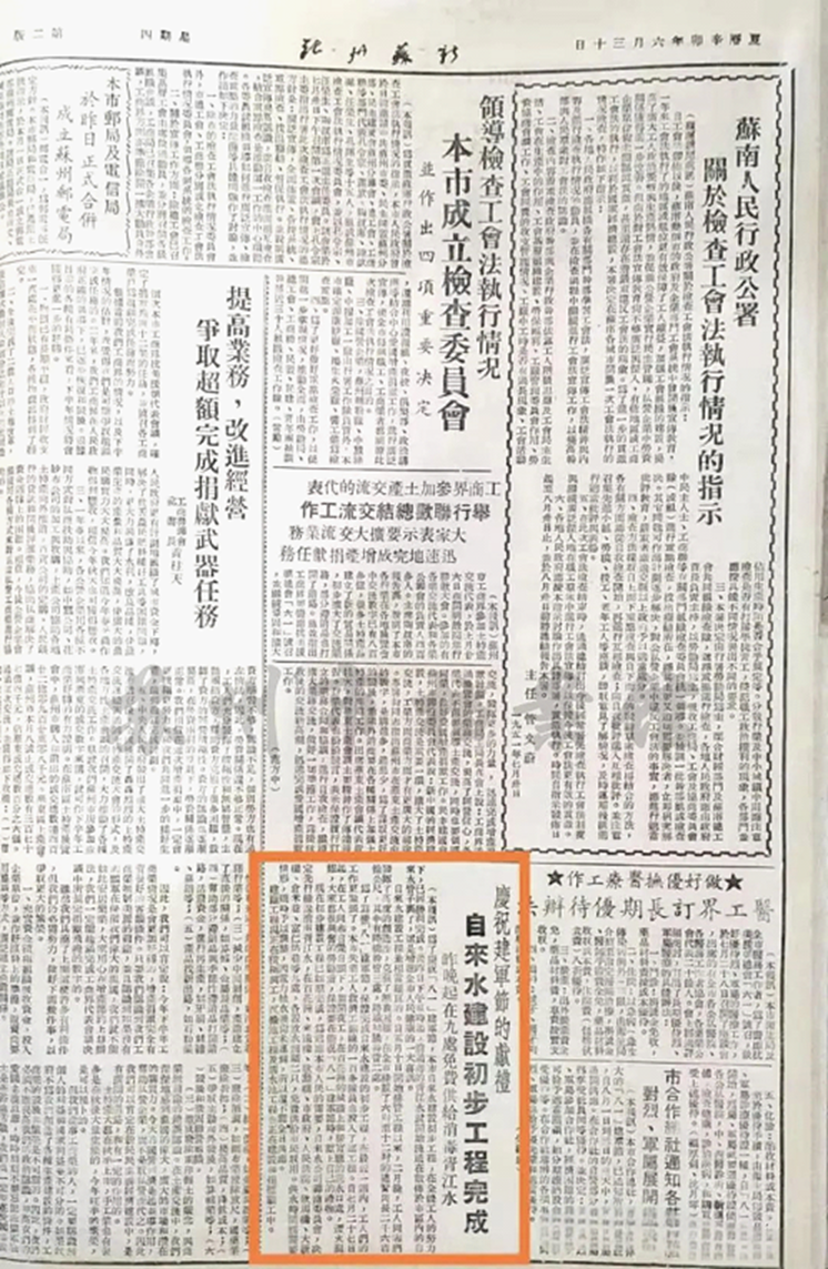 1951年8月2日《新k8凯发官网入口报》上关于自来水建设初步工程完成的报道(k8凯发官网入口市档案馆馆藏)